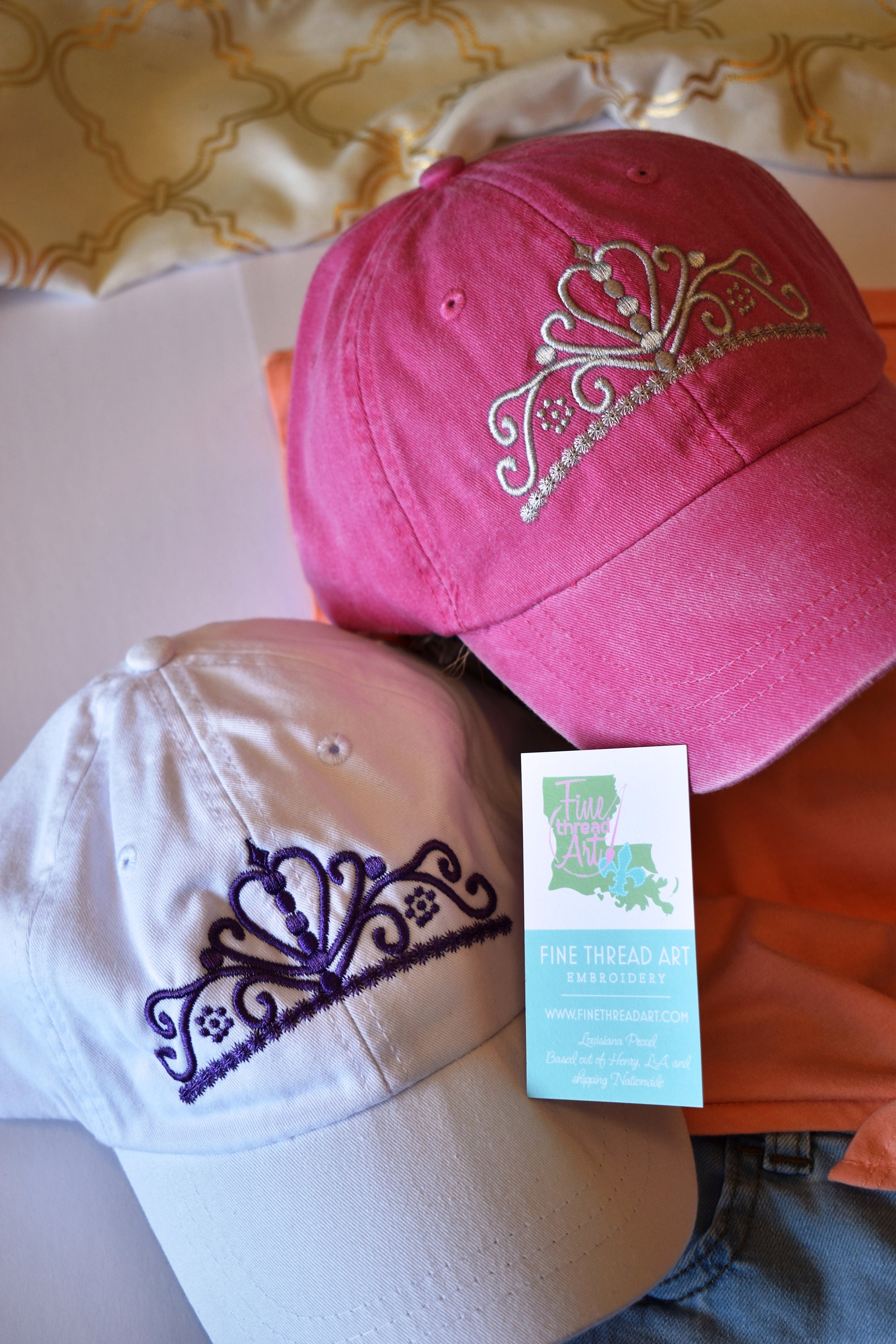 2. Hot pink vintage wash hat with tiara embroidered in silver thread