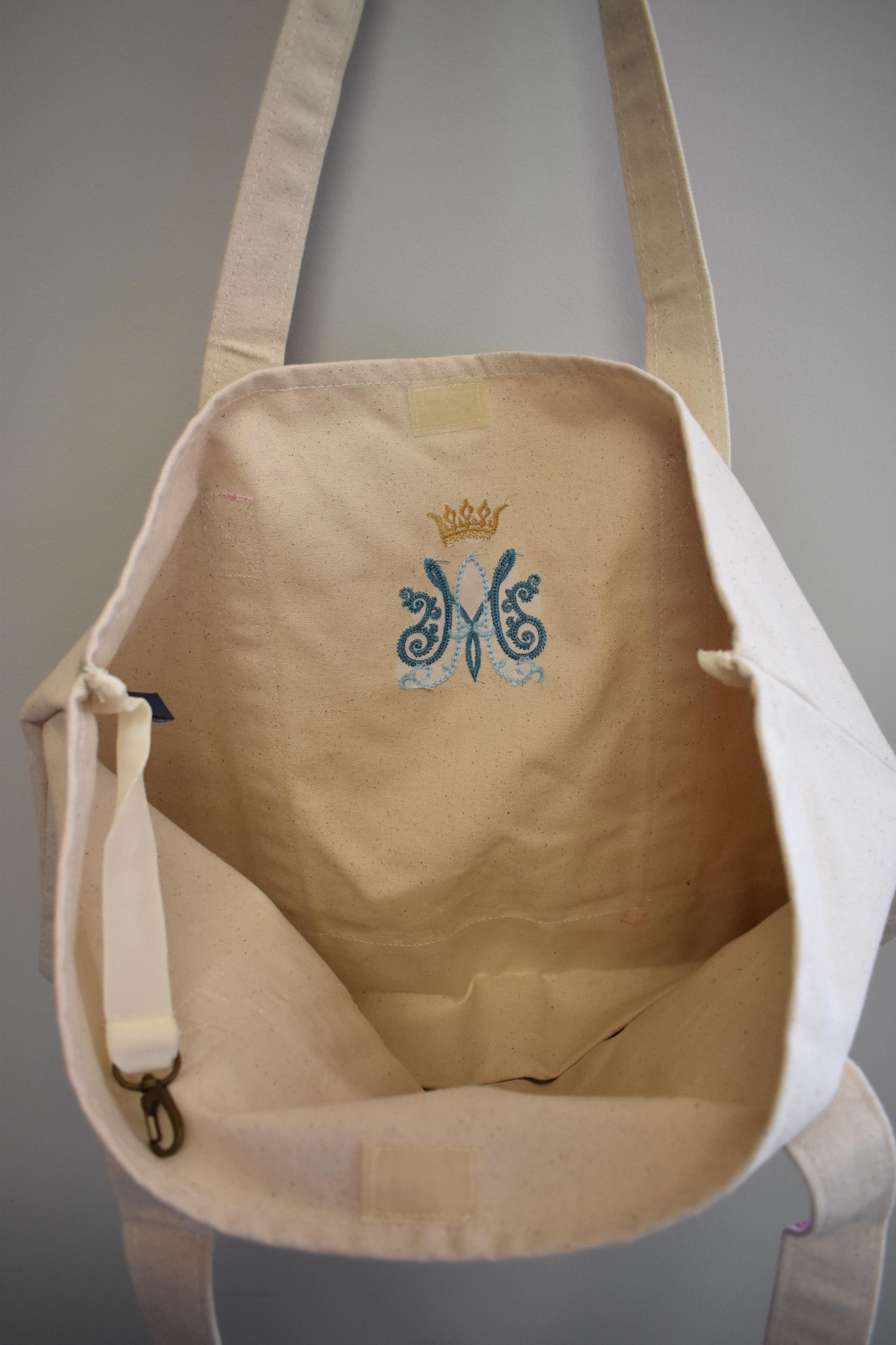 Quick Ship Mary Tote Mother Mary Auspice Maria Virgin Mary Our Lady Catholic Christian Church Monogram Crown Blue Gold Pink Rosary Tote Bag