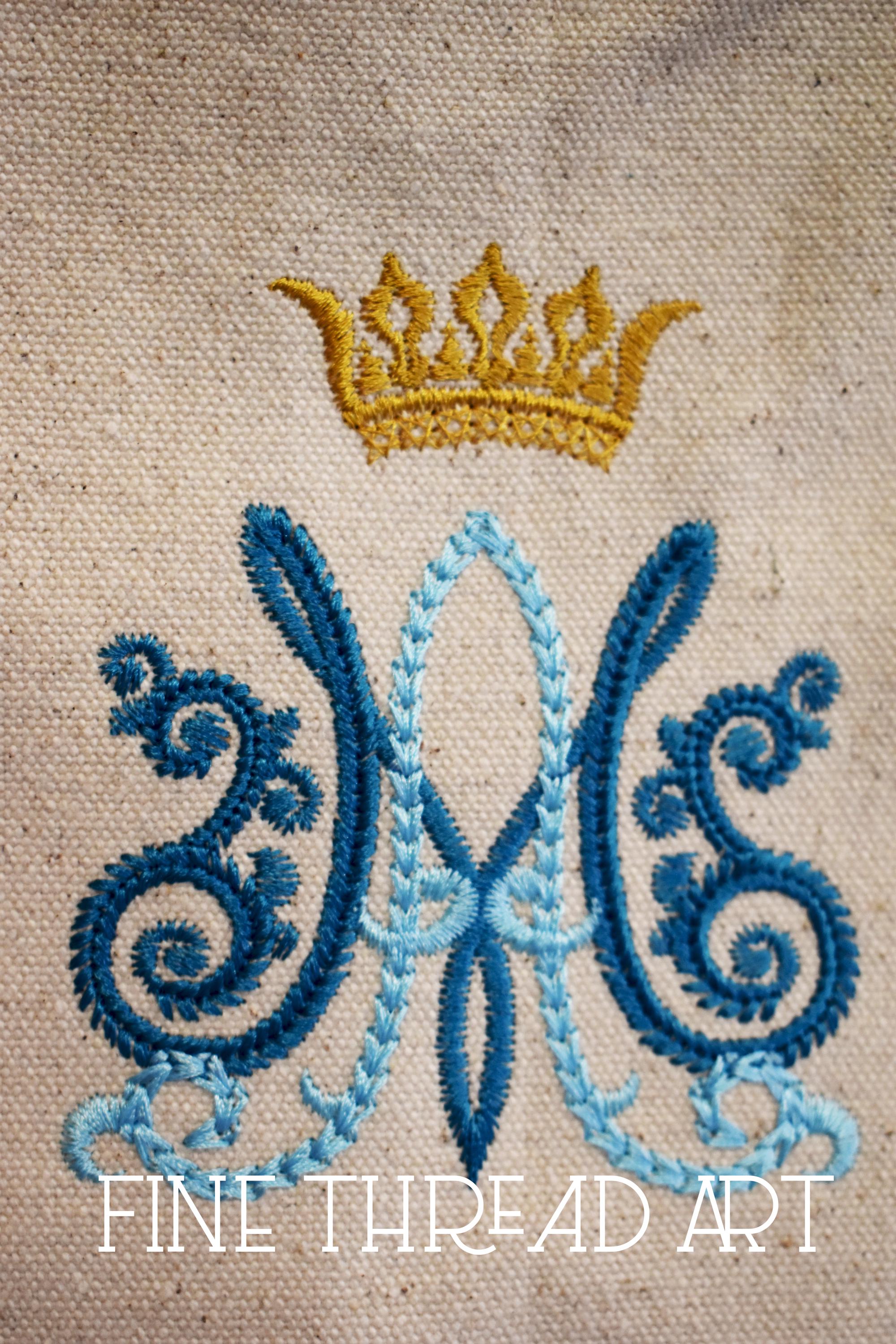 - A and M Auspice Maria monogram in two shades of blue and a gold crown above. Also known as the “Mary Monogram.” It is a symbol of our Mother Mary that means “under the mantle of Mary.” A beautiful symbol and sentiment our Mother.