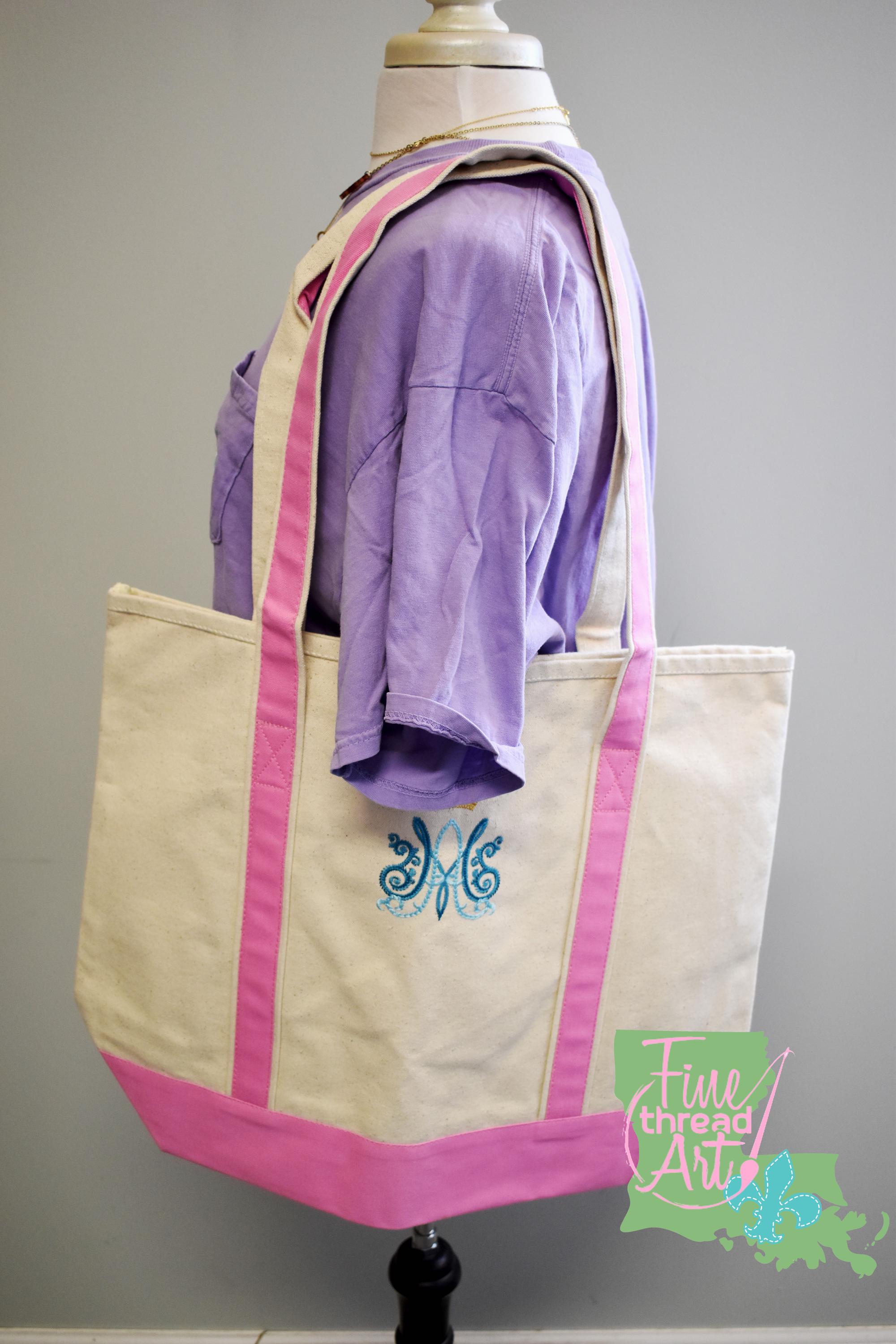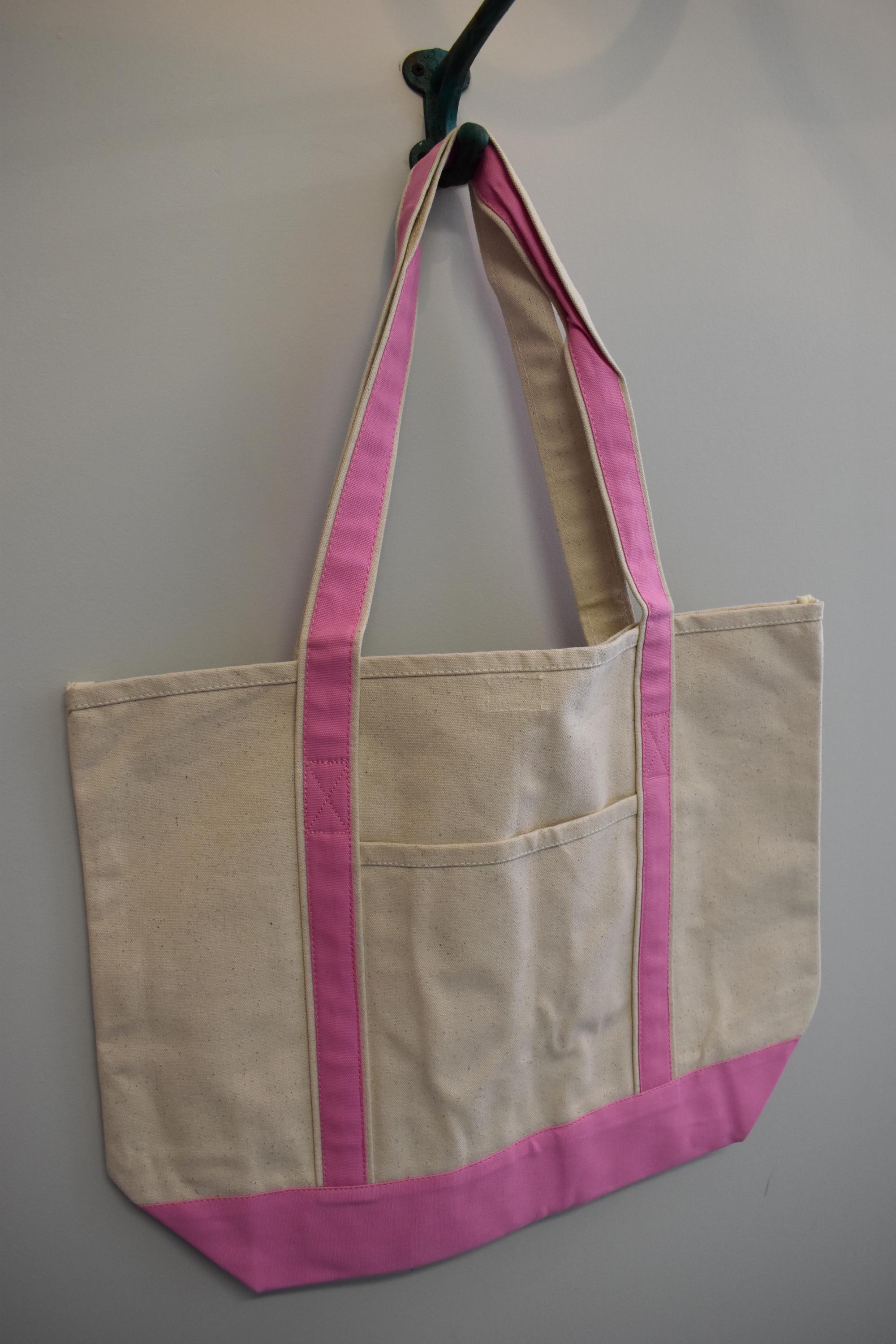 - Natural canvas color bag and bright pink straps and trim