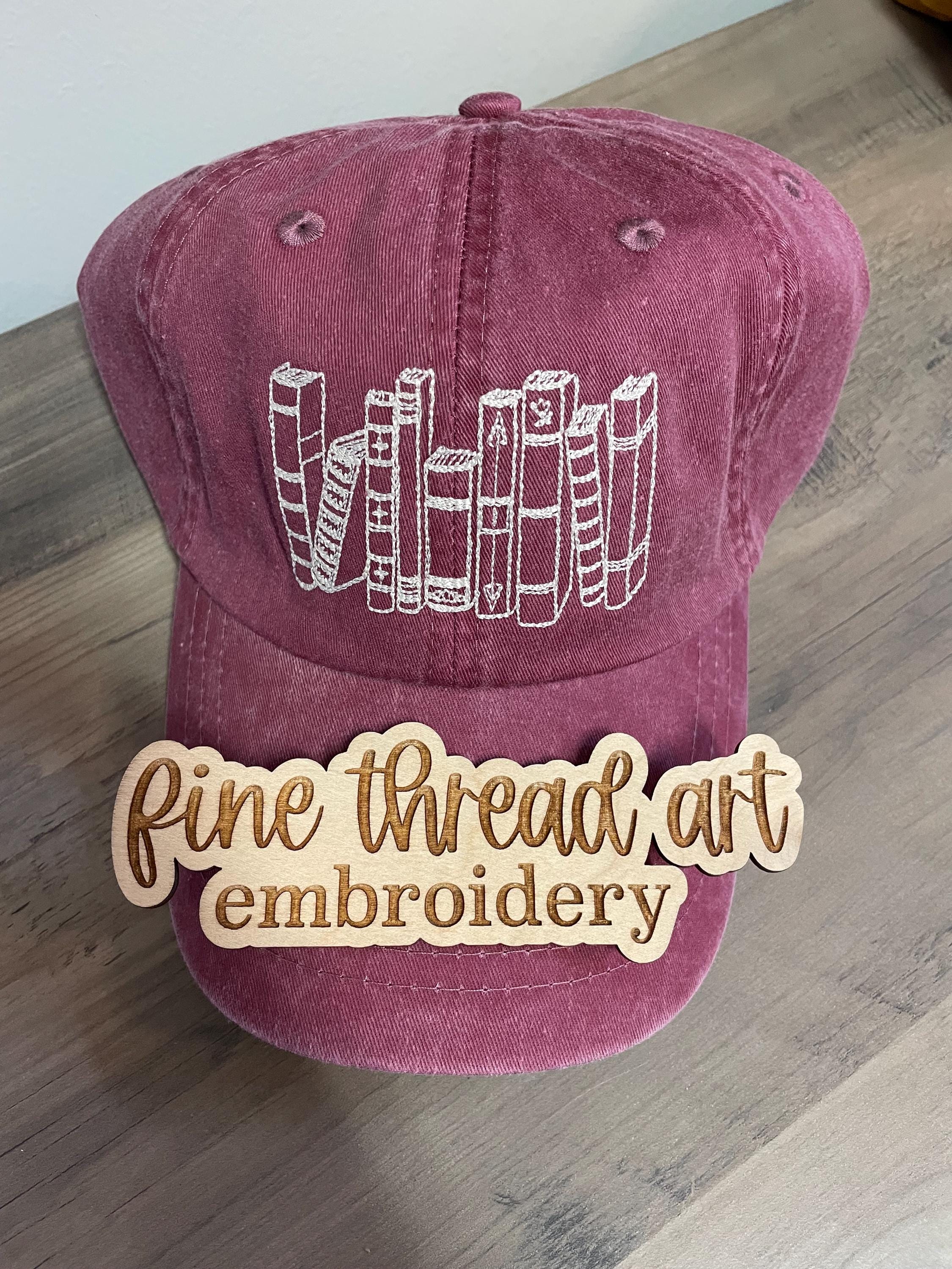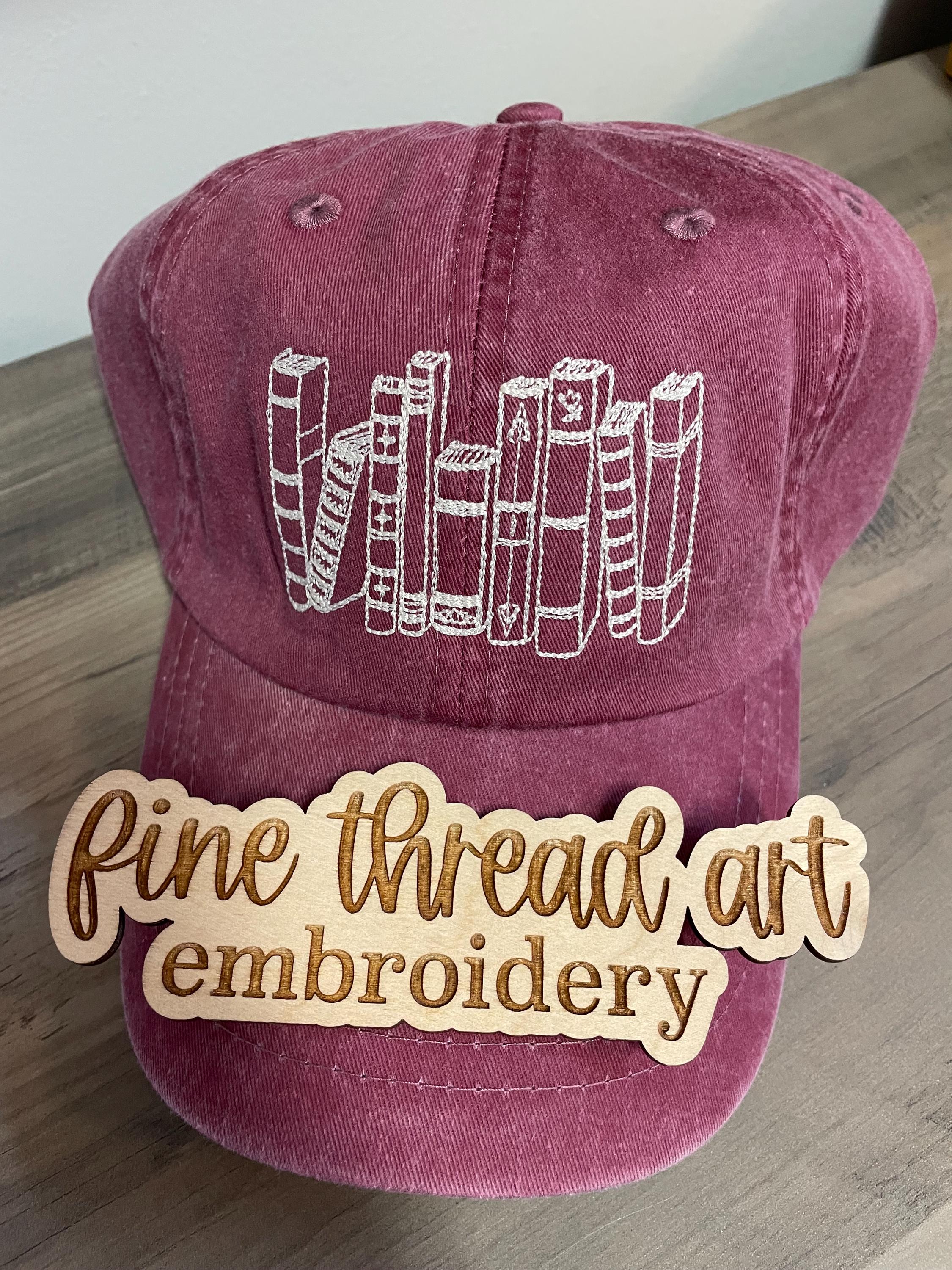 - Books embroidered on the front center right under 2” in height and about 4” in width in a single line stitch to look more like vintage or hand-stitching