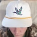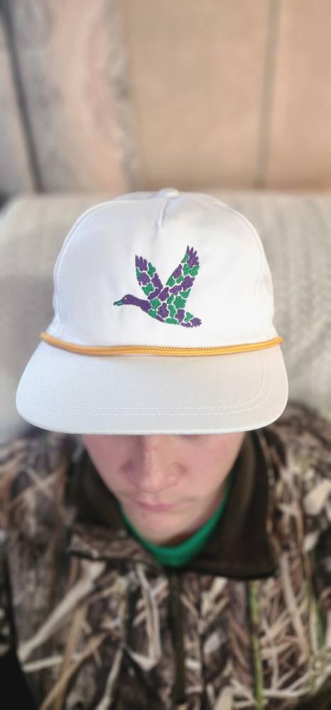 - Main photo shows white hat, gold rope with the camo duck design in kelly green and purple with the eye in shimmering gold. The design is around 2" high by 2.5" wide