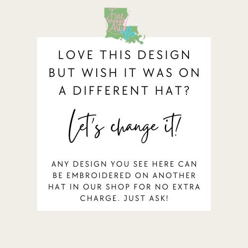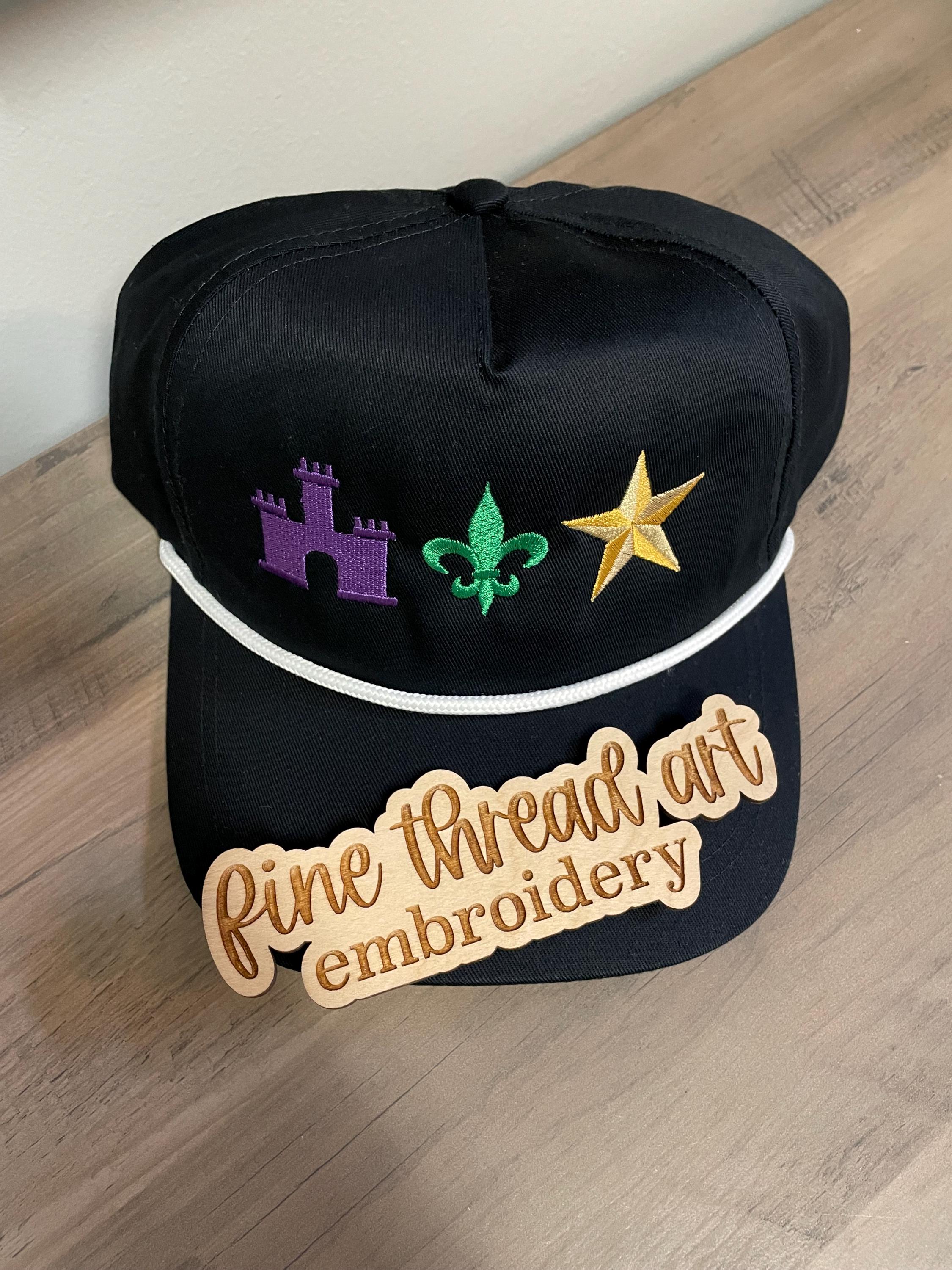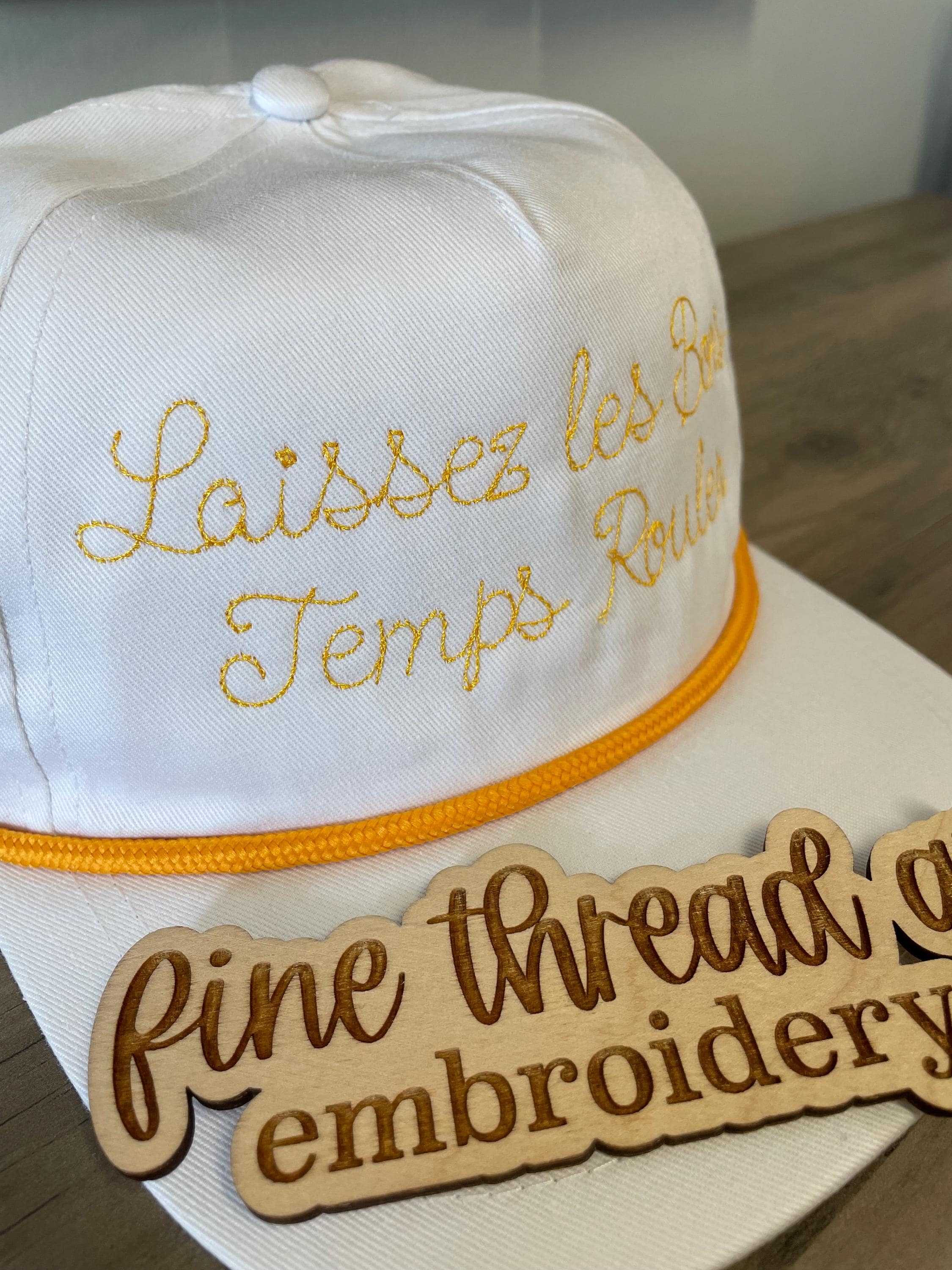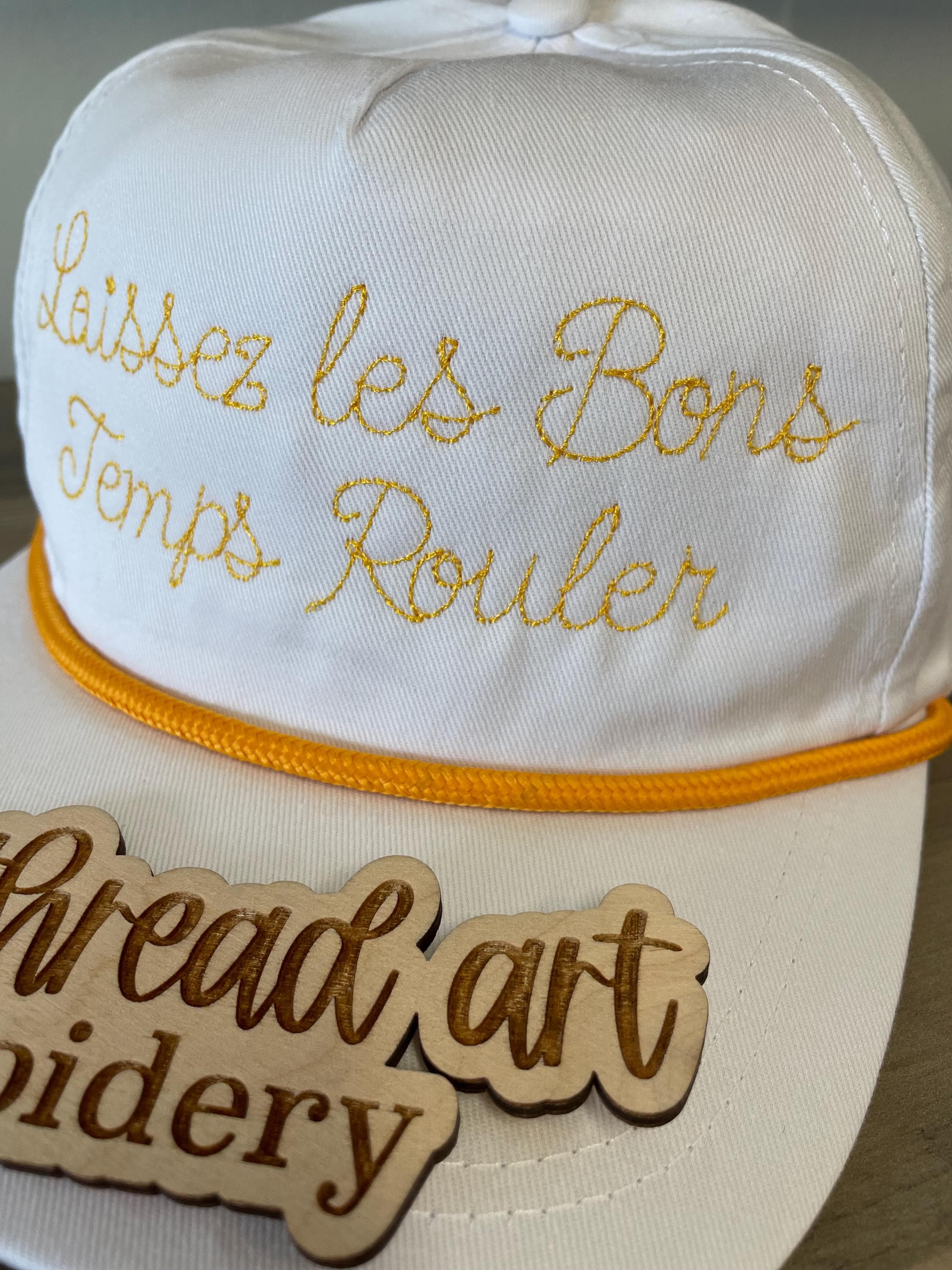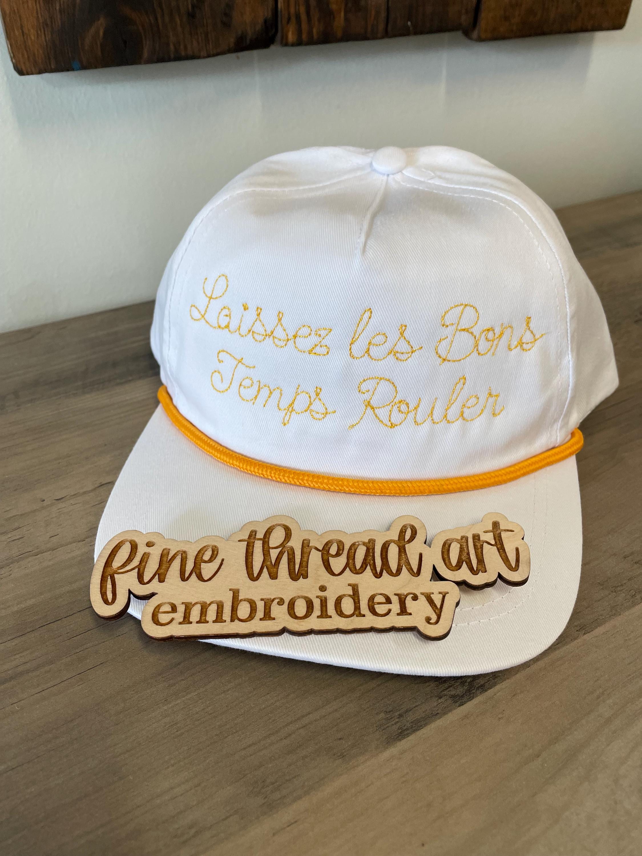 - "Laissez les bons temps rouler" embroidered in goldenrod thread to match the gold rope on front on the hat. The font used is a machine embroidery font meant to look like a vintage hand-stitch.