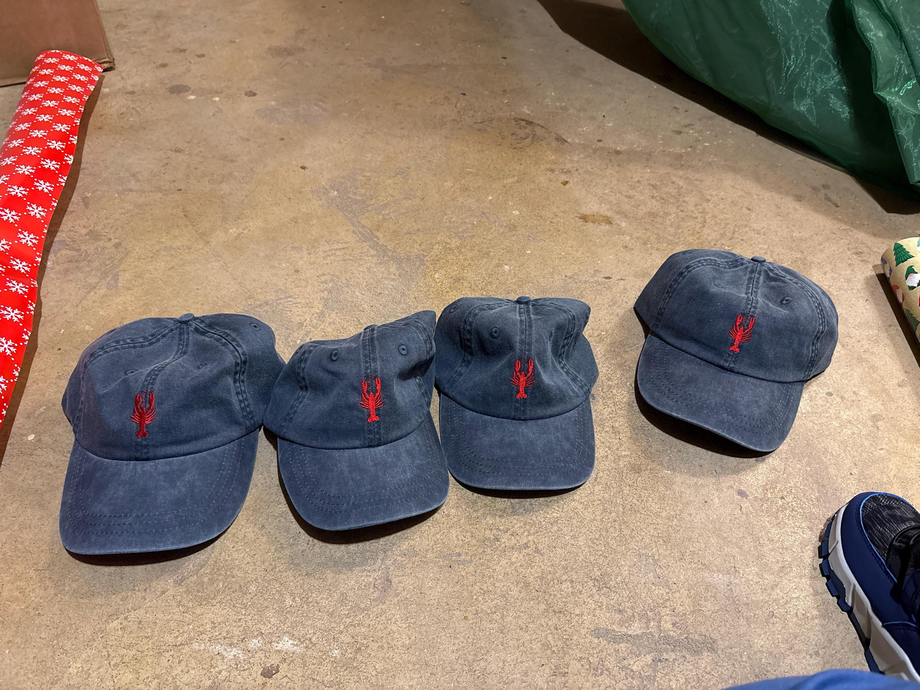- A mini crawfish/lobster design is embroidered on the front center. It is approximately 1.5" tall.